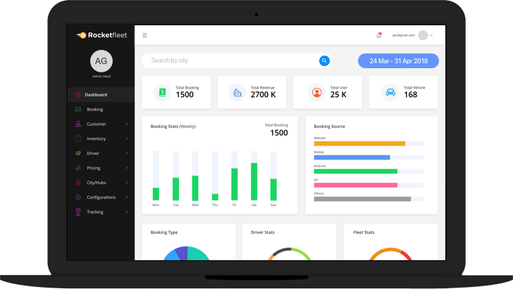RocketFleet Admin Panel ships with features that helps you manage and scale your business with Self-Owned and Supplier Fleet Network, Manage Retail and Business Customers, Track and Manage Chauffeurs, Map Chauffeurs to Fleet based on shifts, Manage Pricing Per City Per Car Model, Manage Trip Life Cycle - Create, Manage, Cancel, Live, Schedule, Completed Trips, Billing & Invoicing, Tracking & Alerts, Reports and Dashboards and many more uber cool features.
